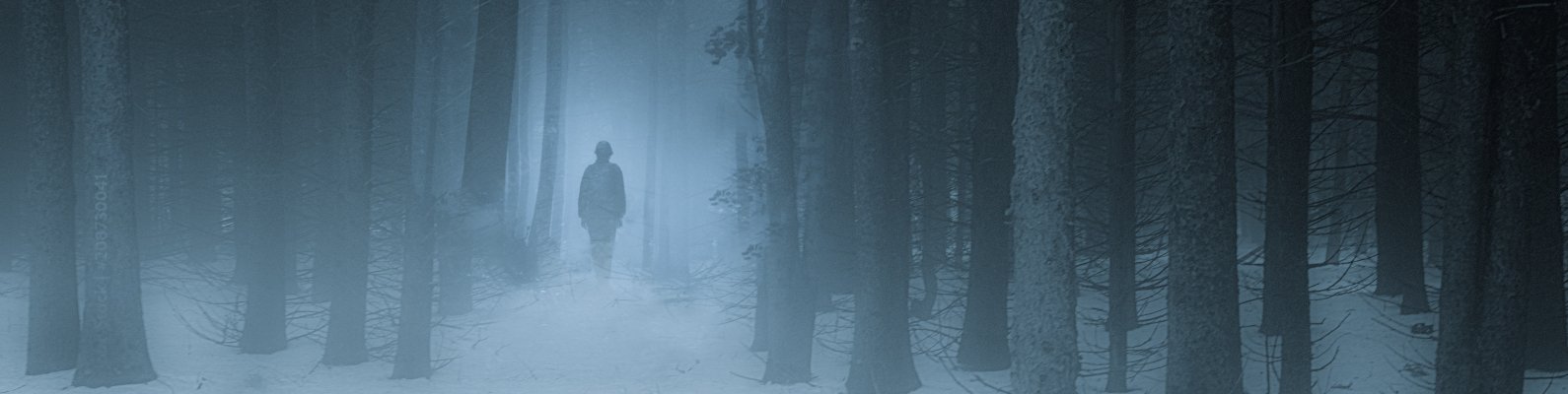 Обои: туманный лес, человек, снег - 1590x400