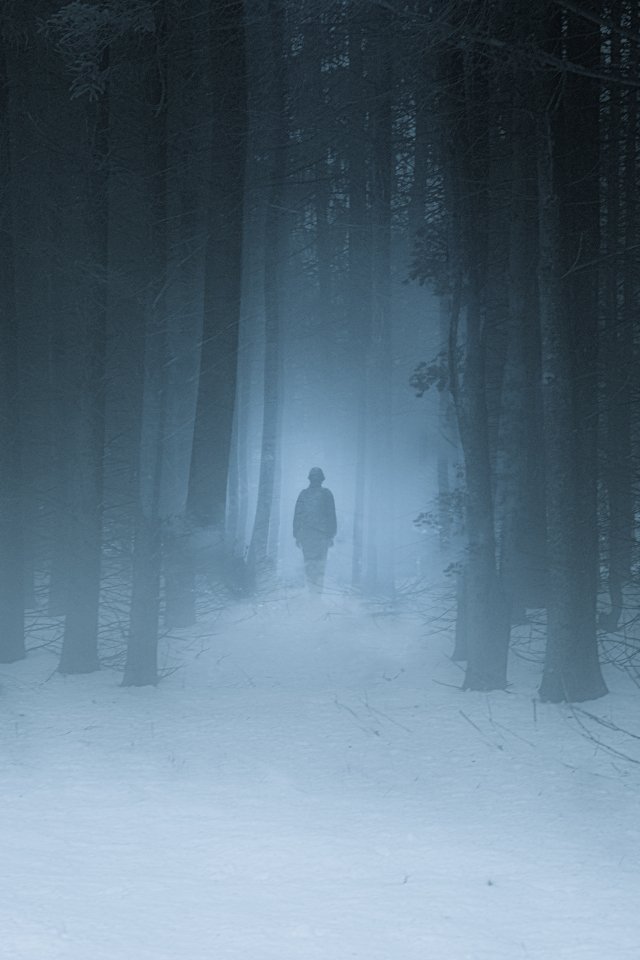 Обои: туманный лес, человек, снег - 640x960