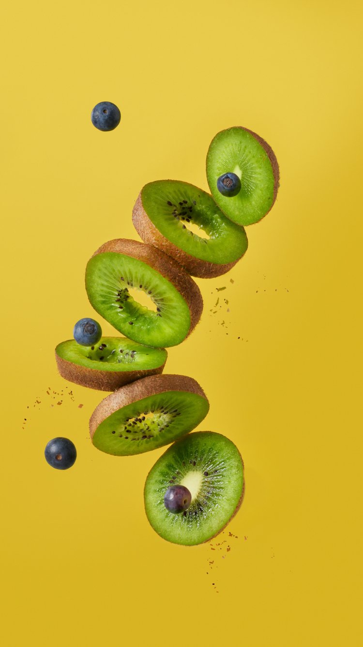 Обои: киви, черника, желтый фон - 750x1334