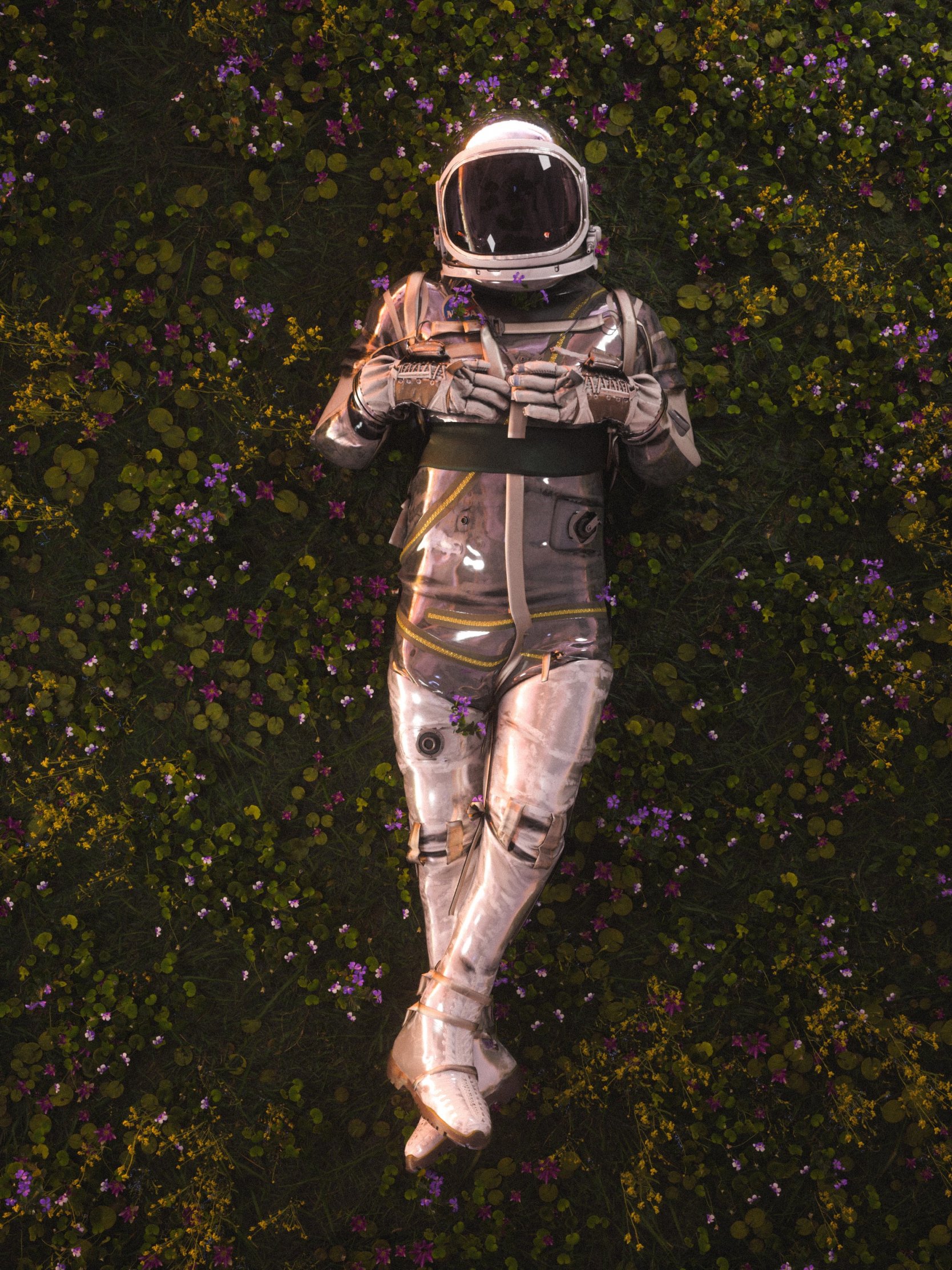 Обои: космонавт, поле, цветы - 1668x2224