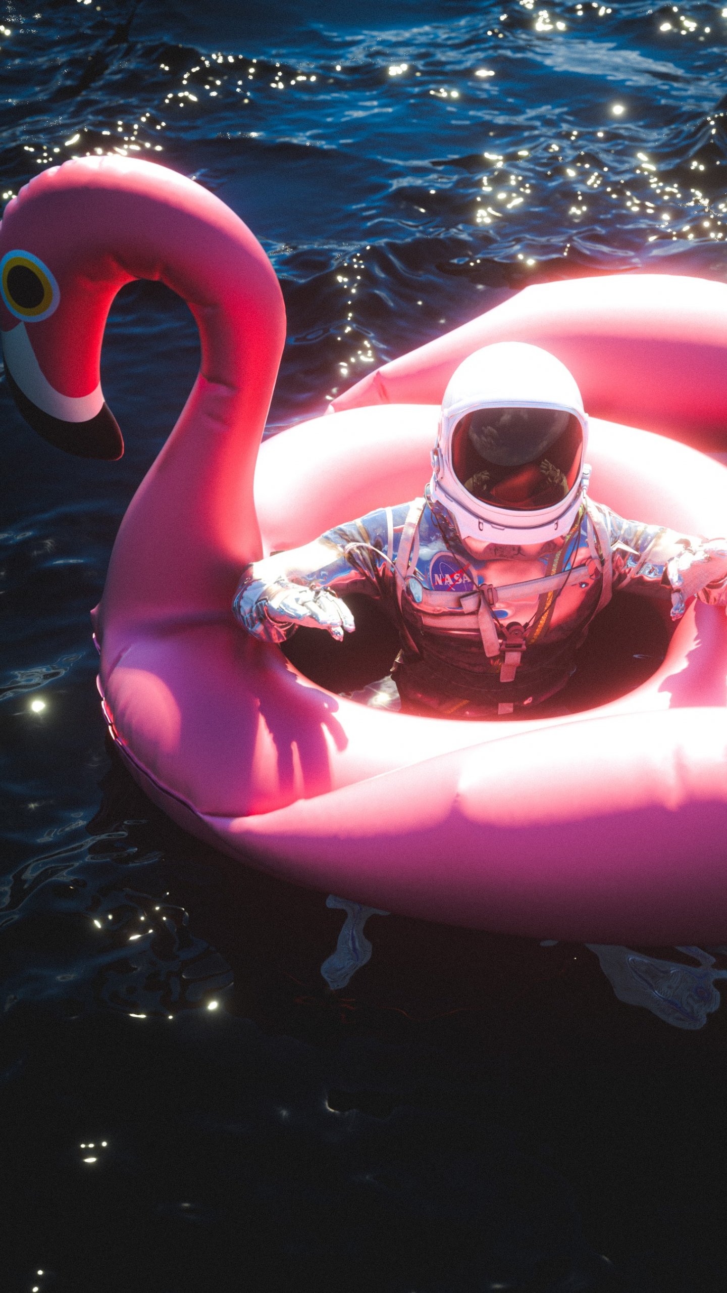 Обои: космонавт, надувной, фламинго - 1440x2560