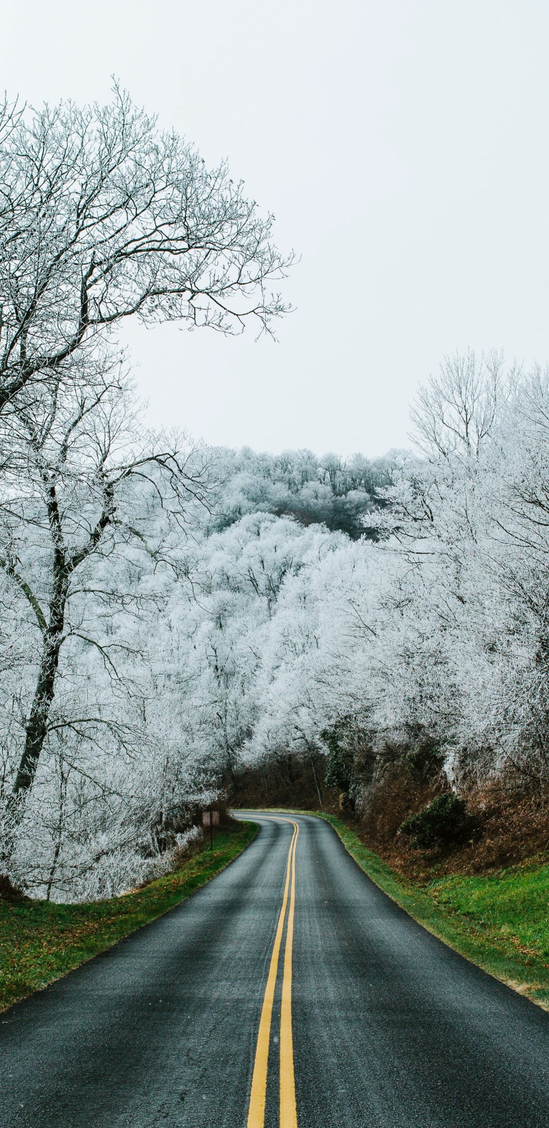 Обои: дорога, снежный лес - 1080x2220