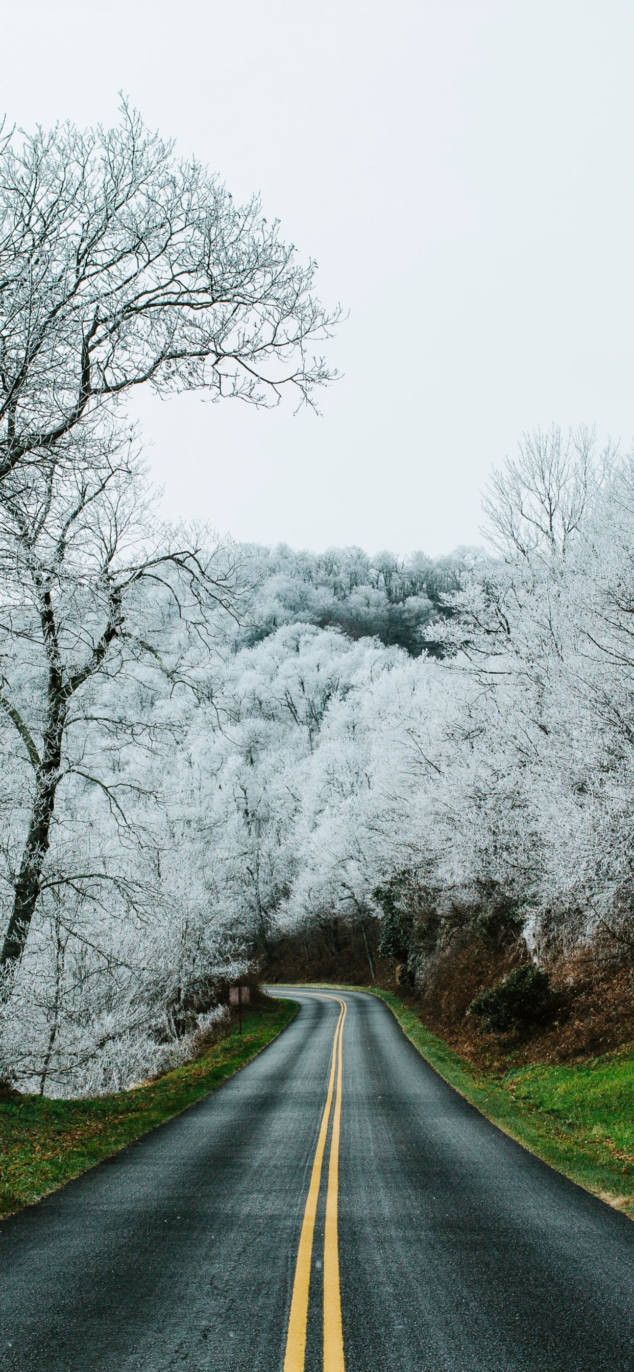 Обои: дорога, снежный лес - 1242x2688