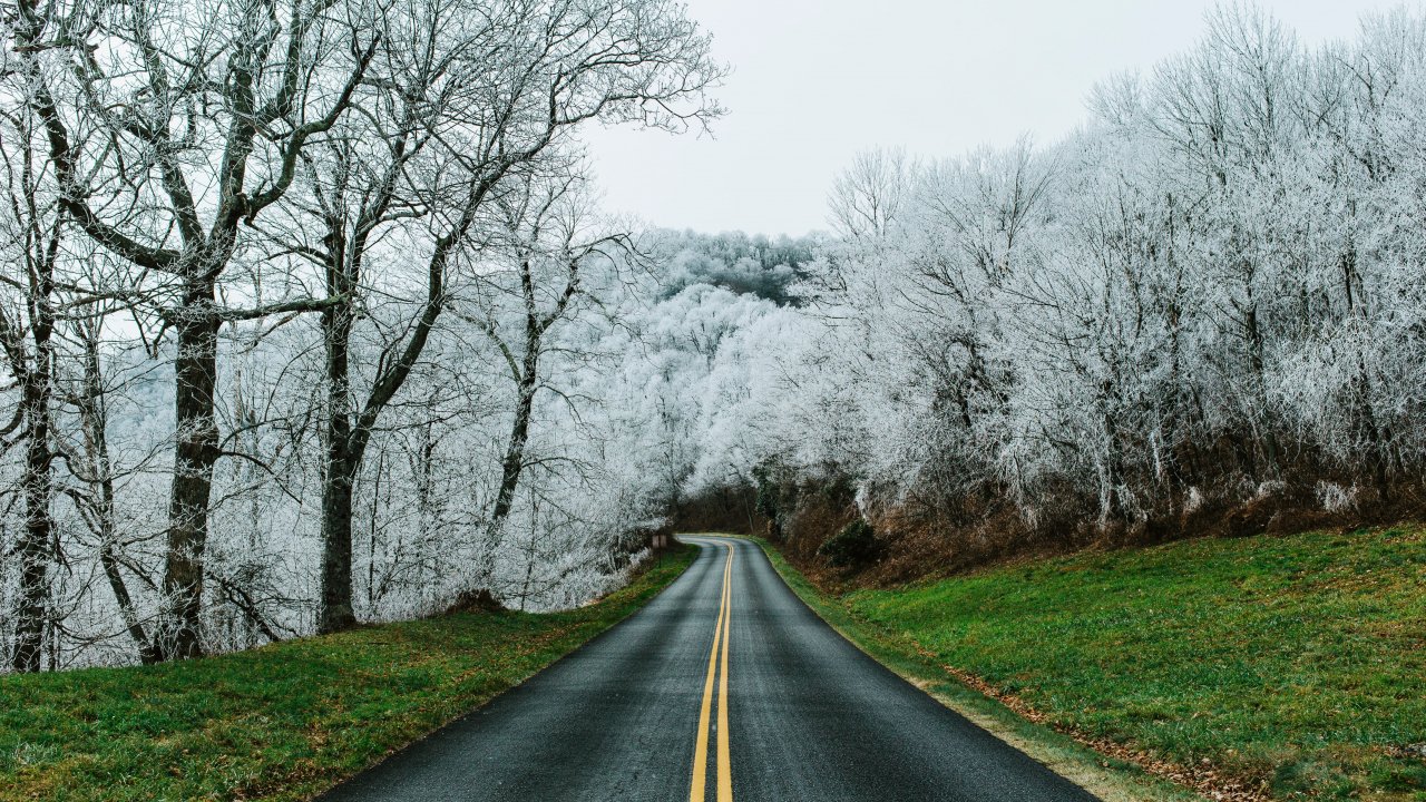 Обои: дорога, снежный лес - 1280x720