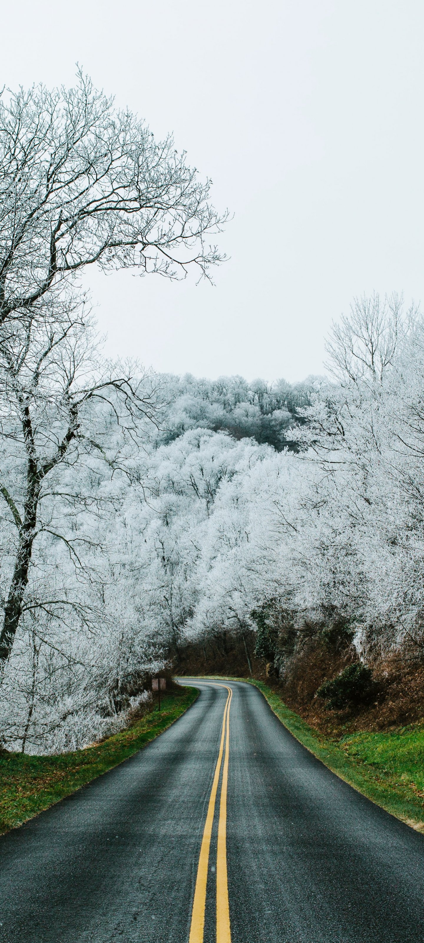 Обои: дорога, снежный лес - 1440x3200