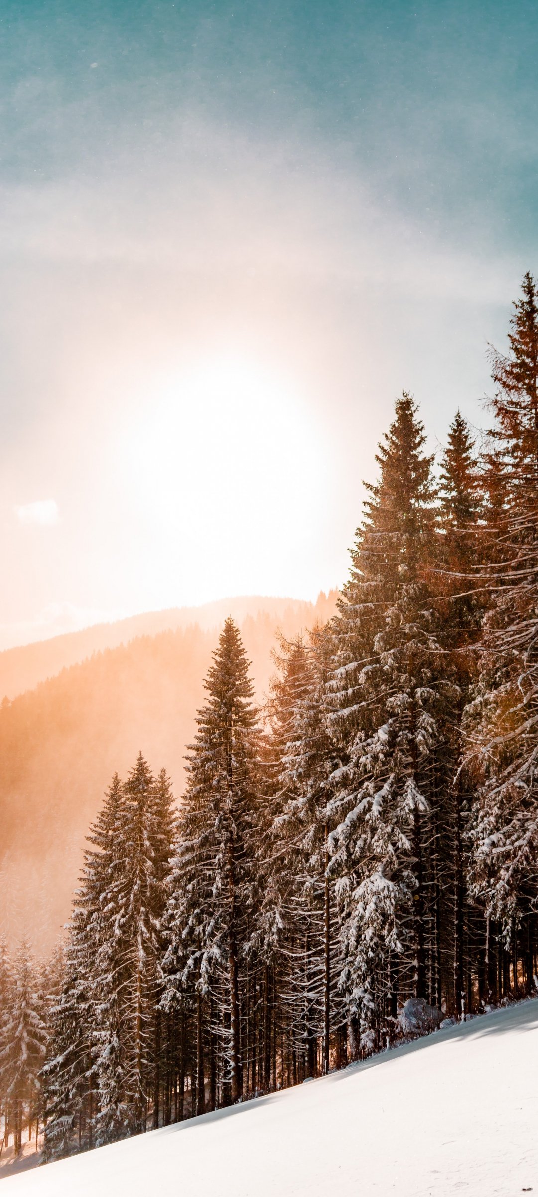 Обои: снежный лес, рассвет, зима - 1080x2400