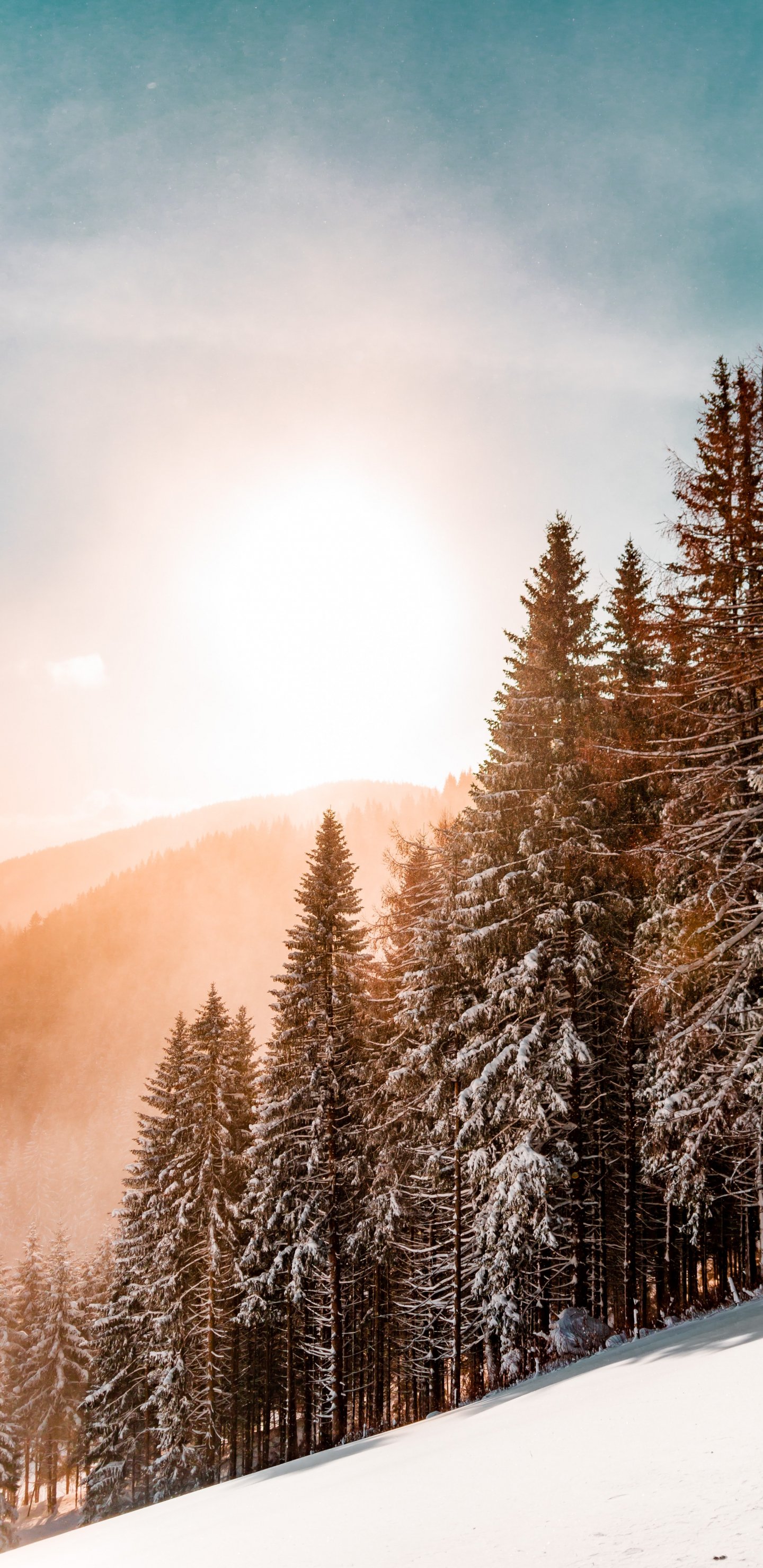 Обои: снежный лес, рассвет, зима - 1440x2960