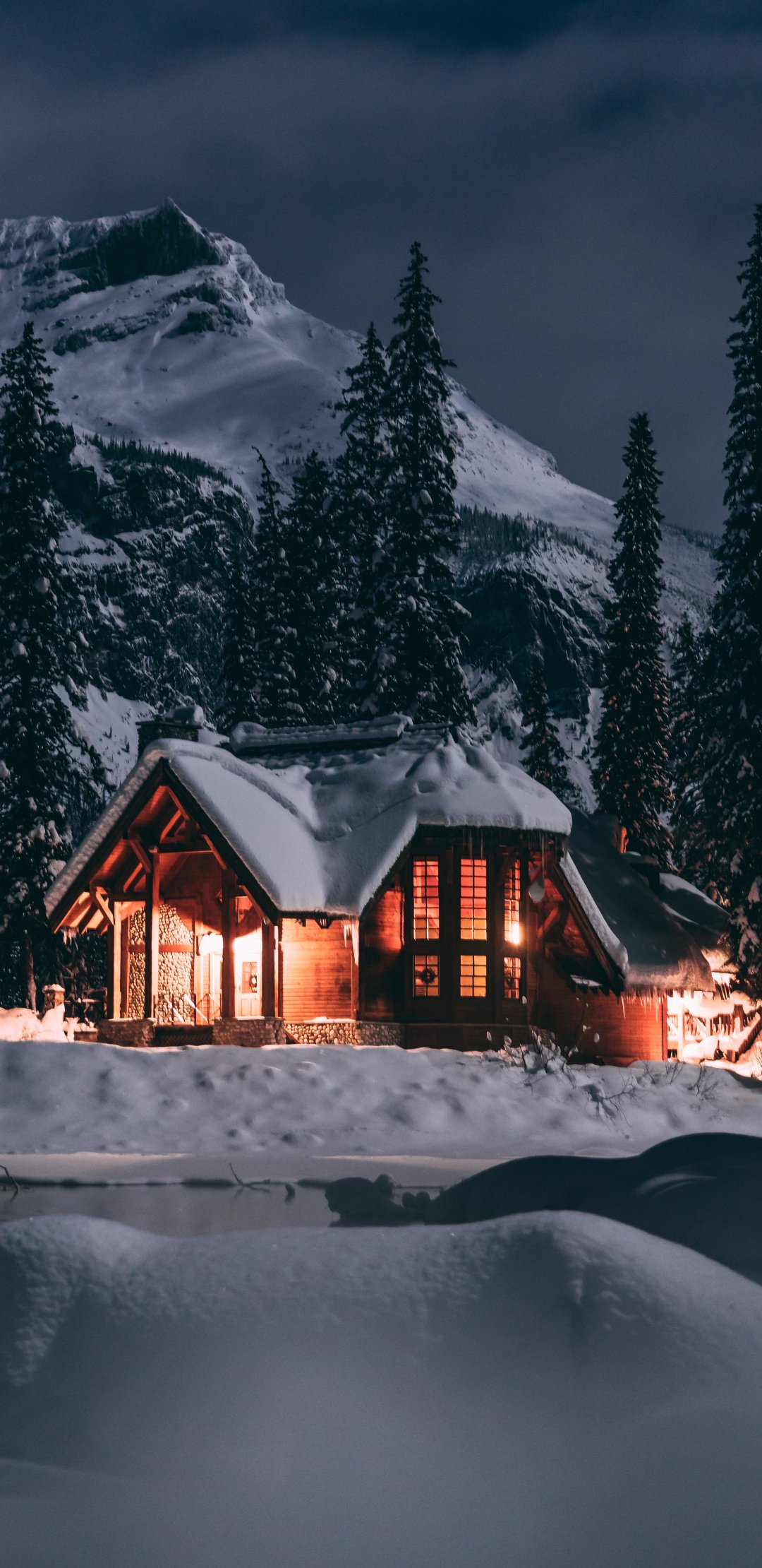 Обои: дом в лесу, зима, ночь - 1080x2220