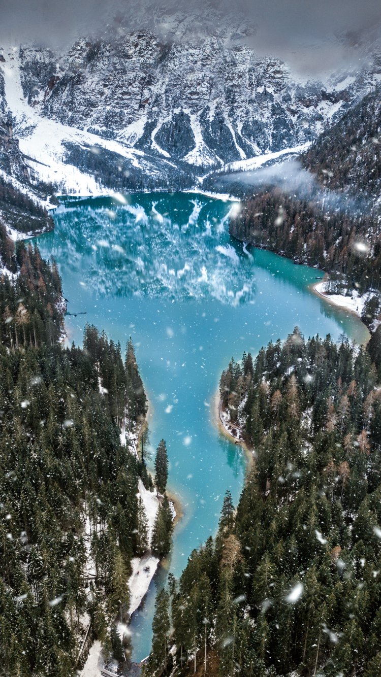 Обои: горы, лес, снегопад - 750x1334