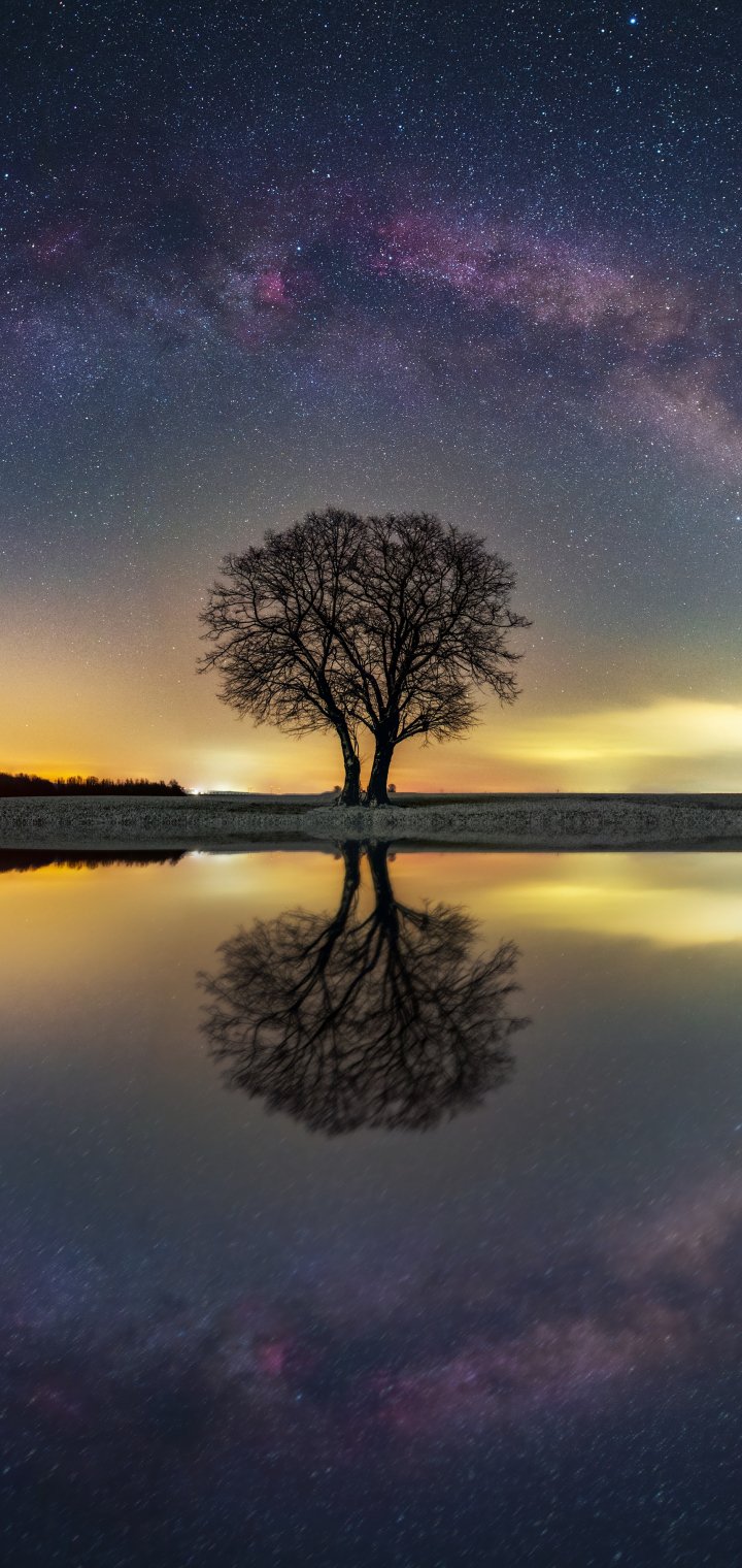 Обои: млечный путь, дерево, озеро - 720x1520