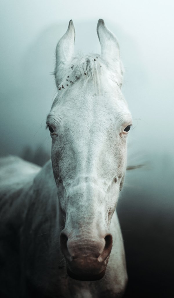 Обои: белая лошадь, туман - 600x1024