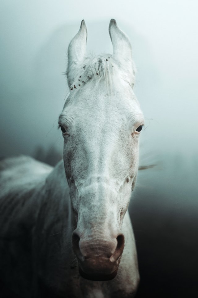 Обои: белая лошадь, туман - 640x960