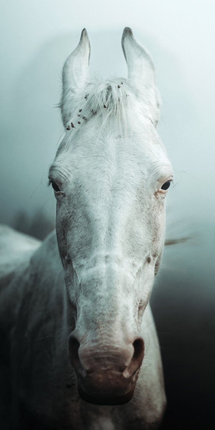 Обои: белая лошадь, туман - 720x1440