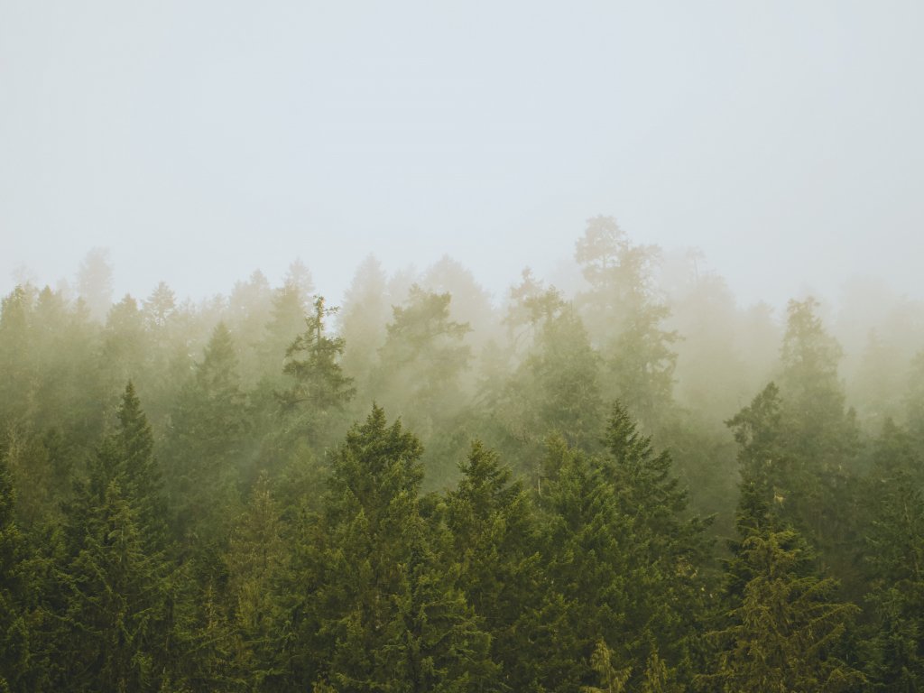 Обои: хвойный лес, туман - 1024x768
