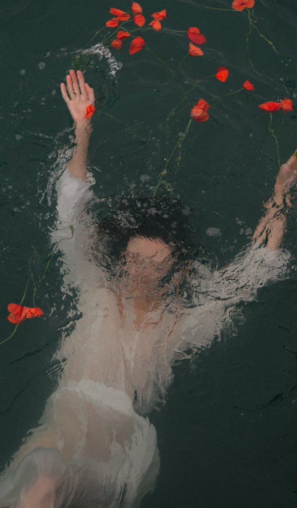 Обои: под водой, девушка, цветы - 600x1024
