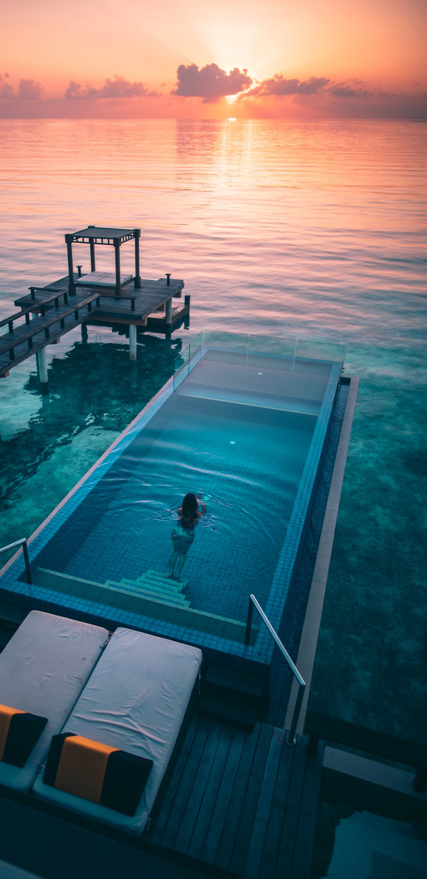 Обои: Мальдивы, закат, бассейн - 1440x2960