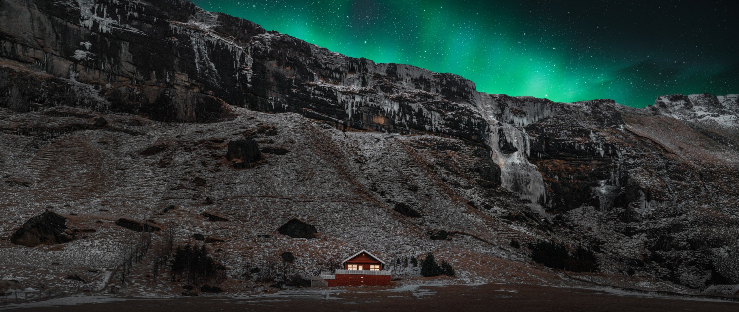 Обои: Исландия, дом у озера - 2560x1080