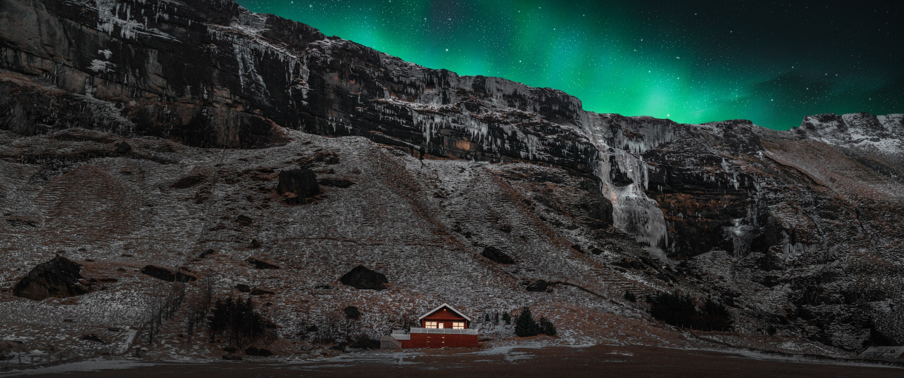 Обои: Исландия, дом у озера - 3440x1440
