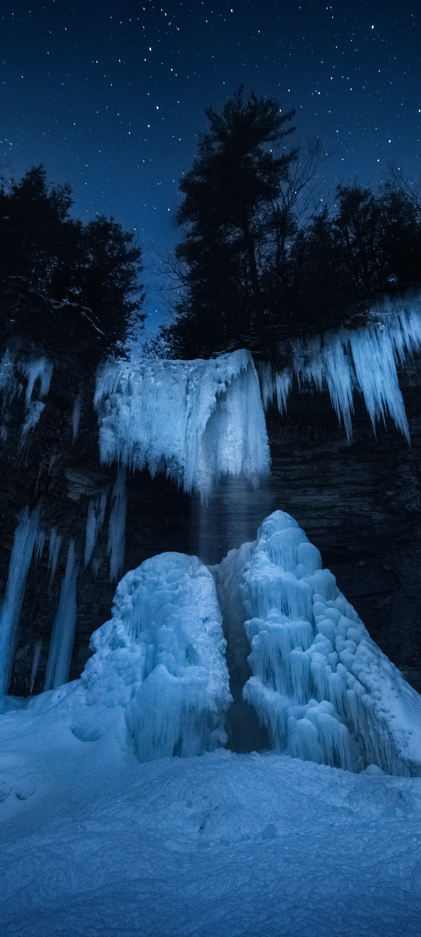 Обои: замерзший водопад, ночной лес, зима - 1440x3200