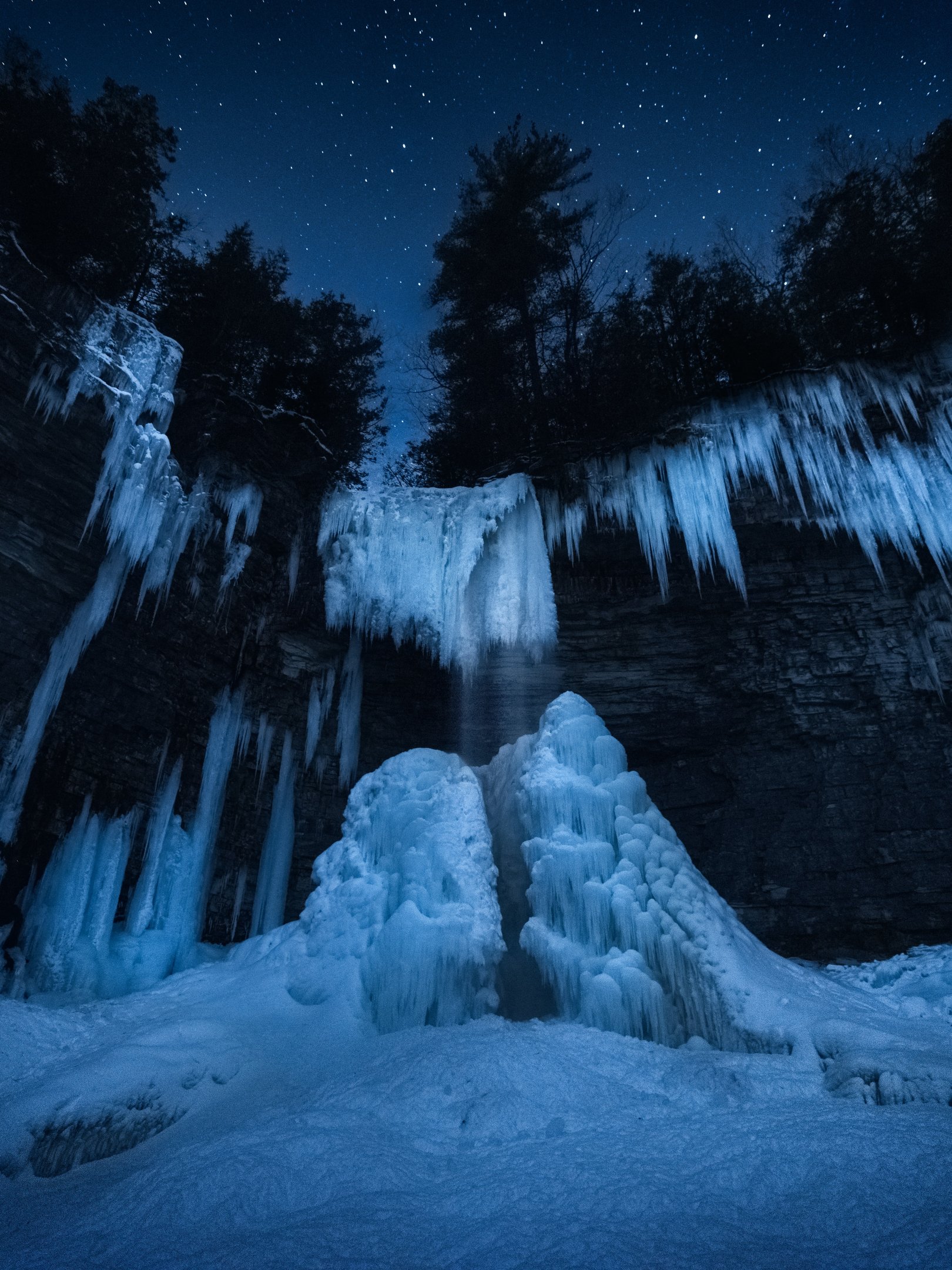 Обои: замерзший водопад, ночной лес, зима - 1620x2160