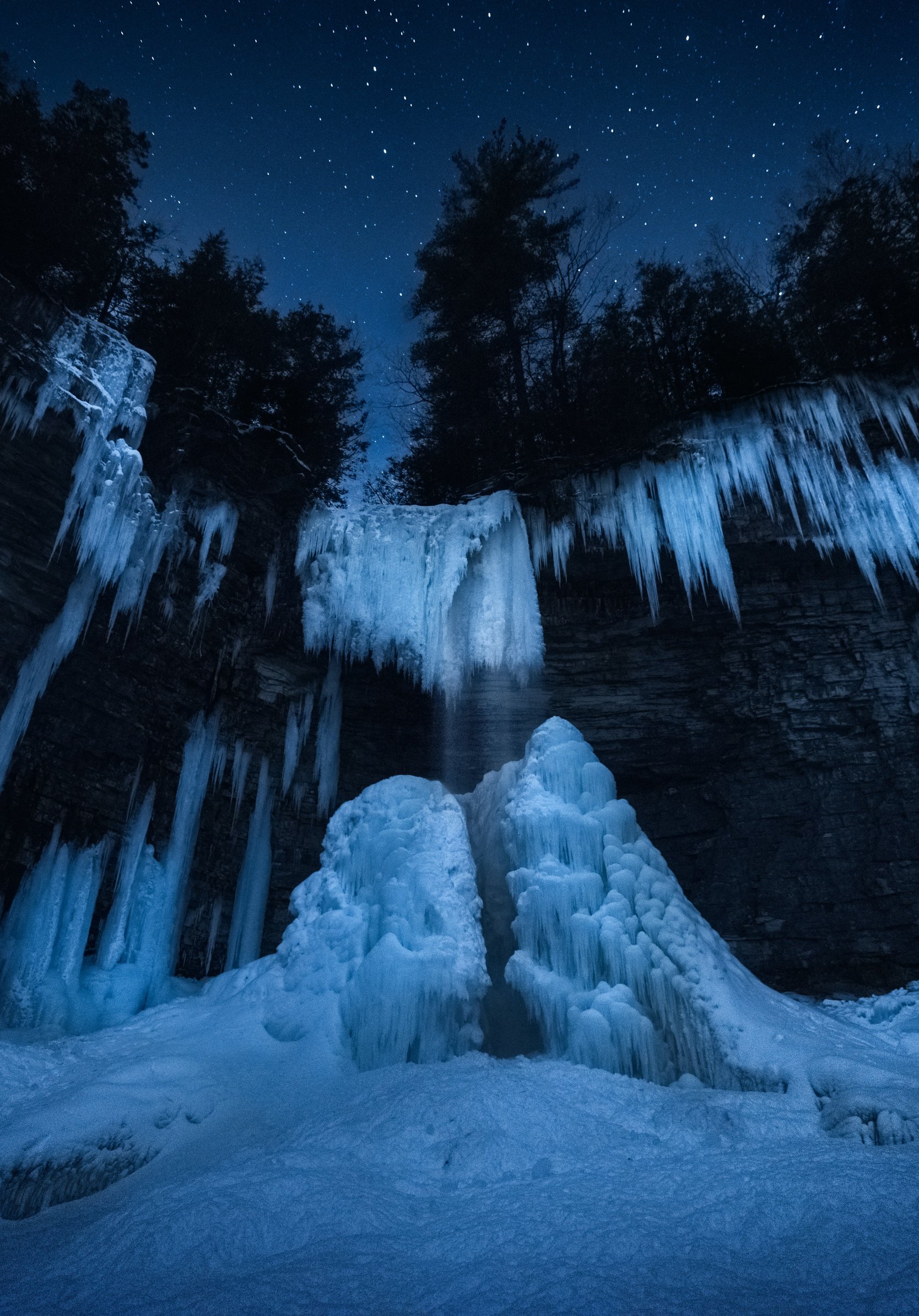 Обои: замерзший водопад, ночной лес, зима - 1668x2388