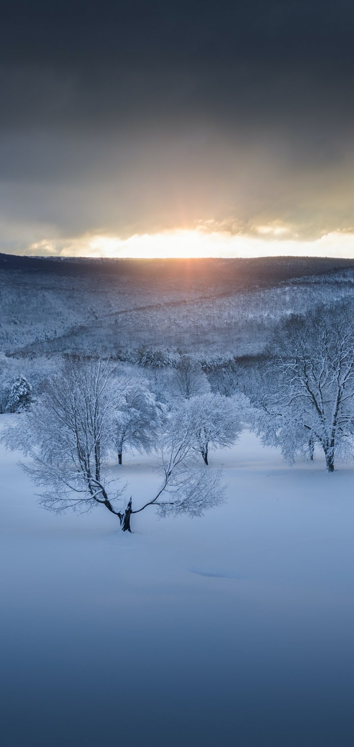 Обои: зимний лес, закат, зима - 720x1520
