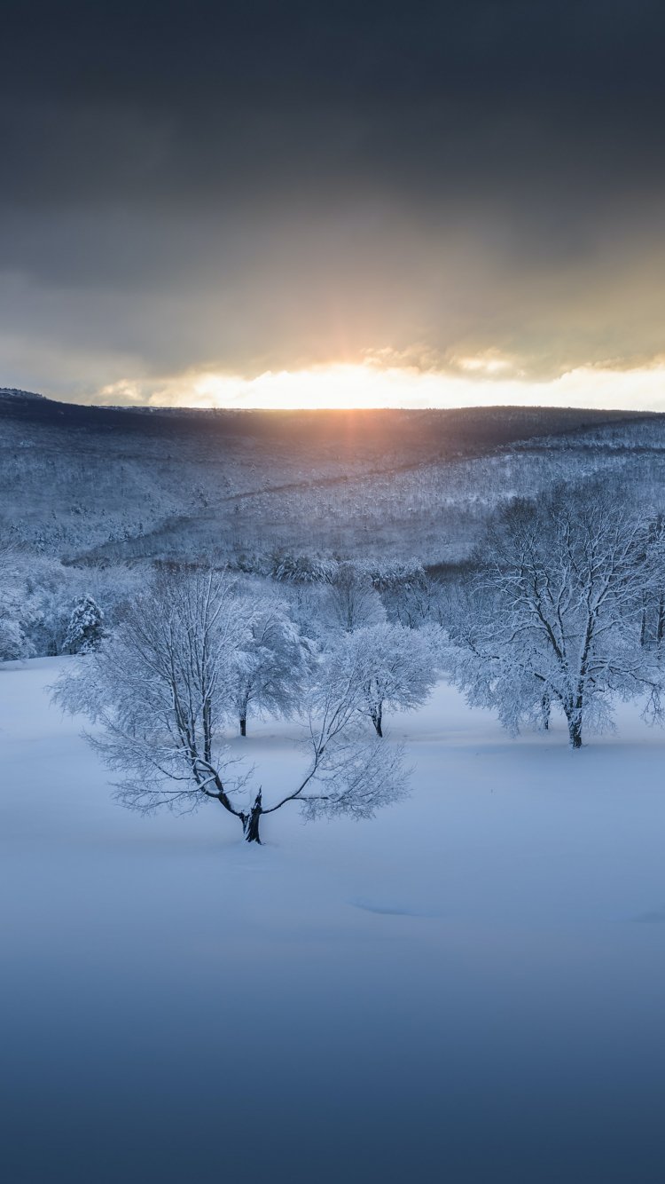 Обои: зимний лес, закат, зима - 750x1334