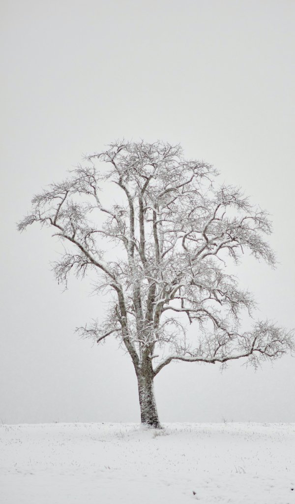 Обои: одинокое дерево, зима, белый - 600x1024