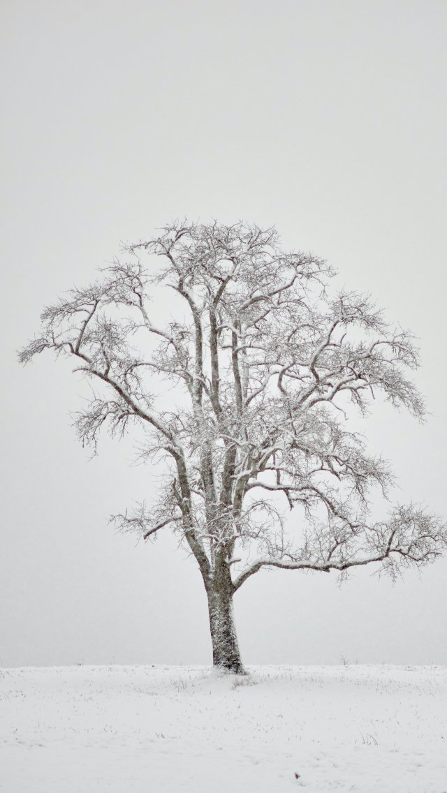 Обои: одинокое дерево, зима, белый - 640x1136