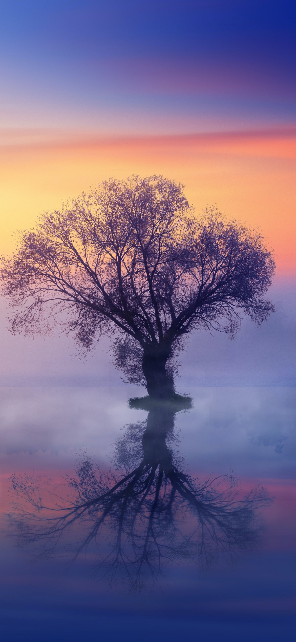 Обои: одинокое дерево, туман, отражение в воде - 1170x2532