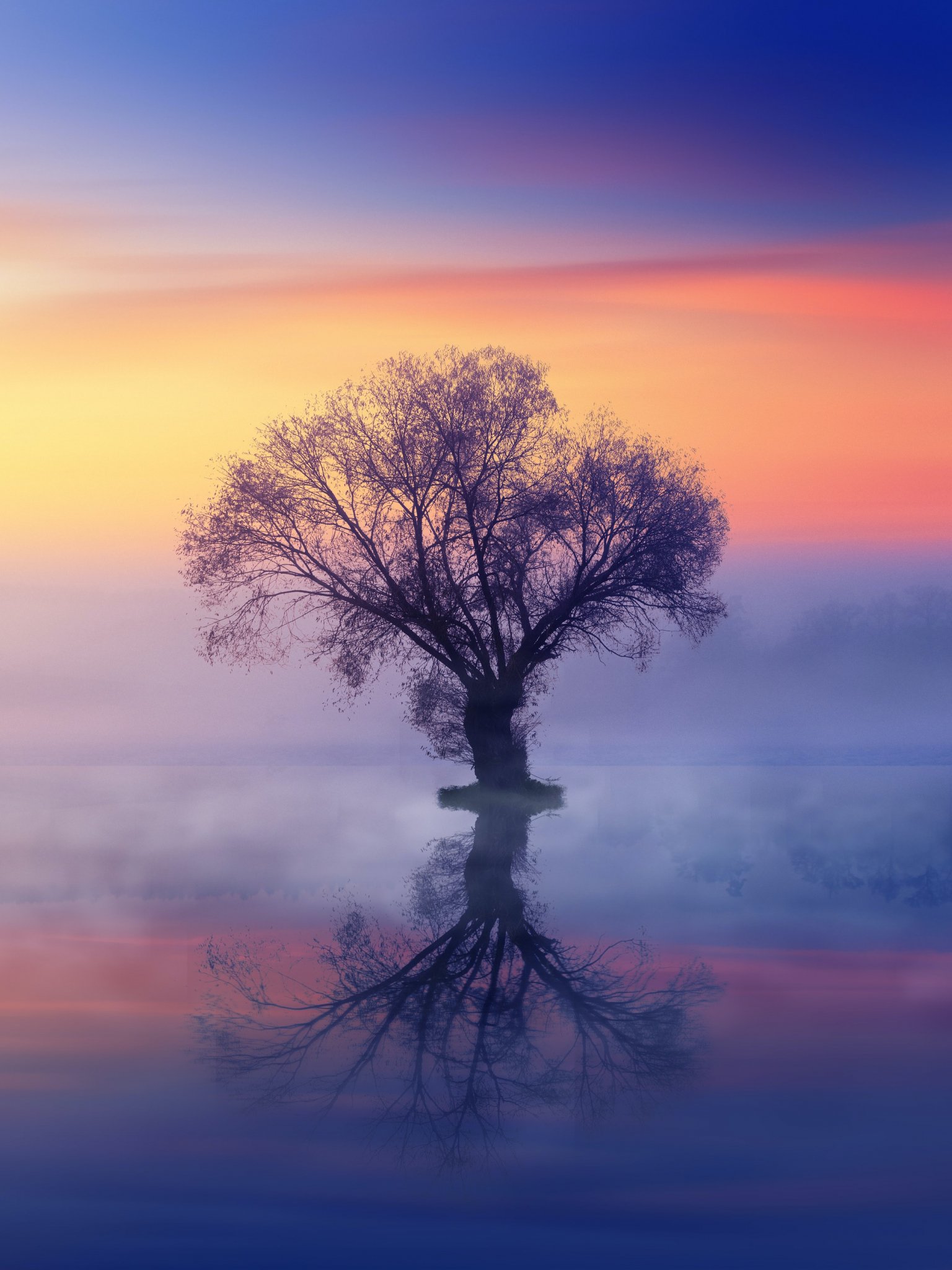 Обои: одинокое дерево, туман, отражение в воде - 1536x2048