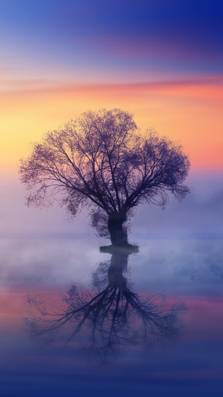Обои: одинокое дерево, туман, отражение в воде - 720x1280