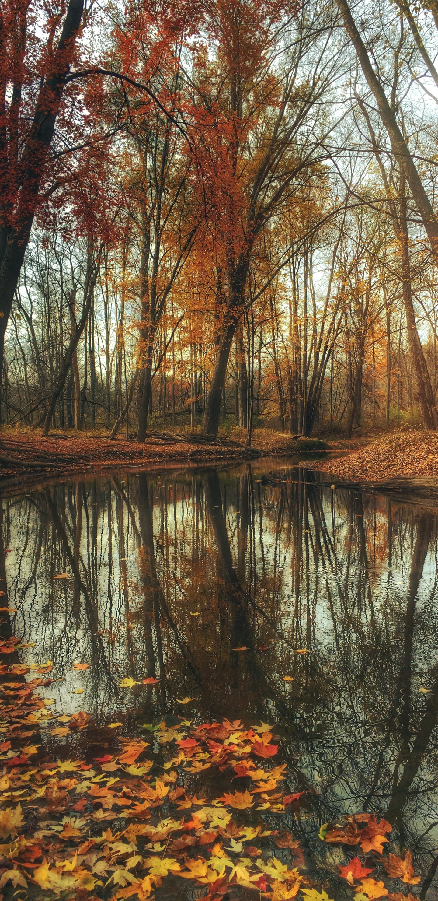 Обои: осенний лес, пруд, коричневый - 1440x2960