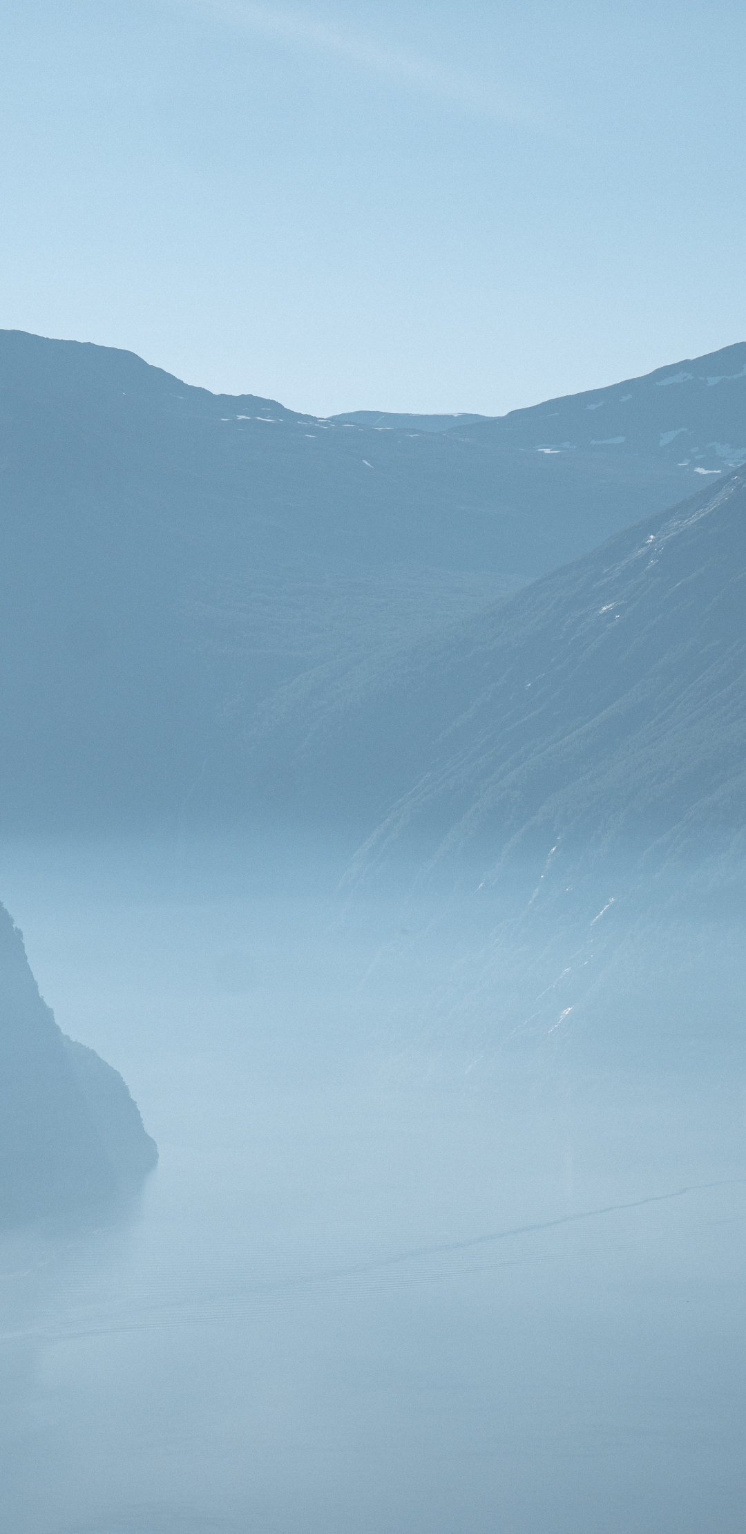 Обои: горный пейзаж, туман, голубой - 1080x2220