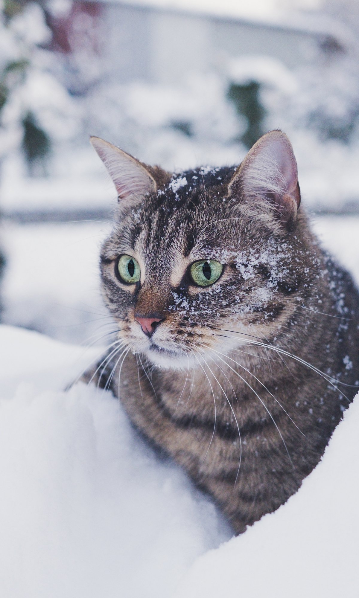 Обои: полосатый кот, снег, зеленые глаза - 1200x2000