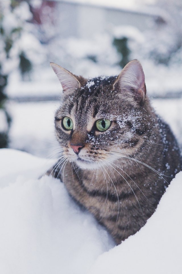 Обои: полосатый кот, снег, зеленые глаза - 640x960