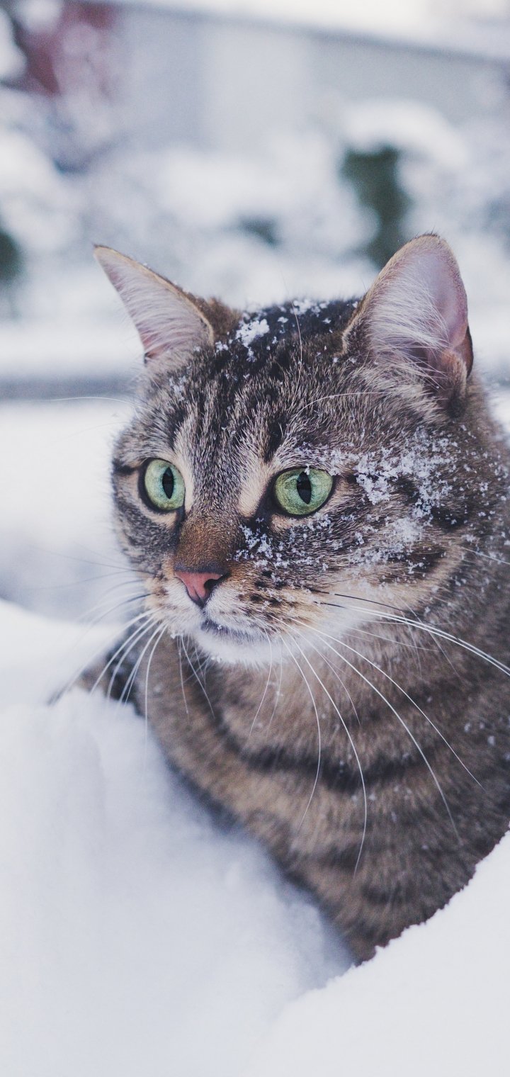 Обои: полосатый кот, снег, зеленые глаза - 720x1520