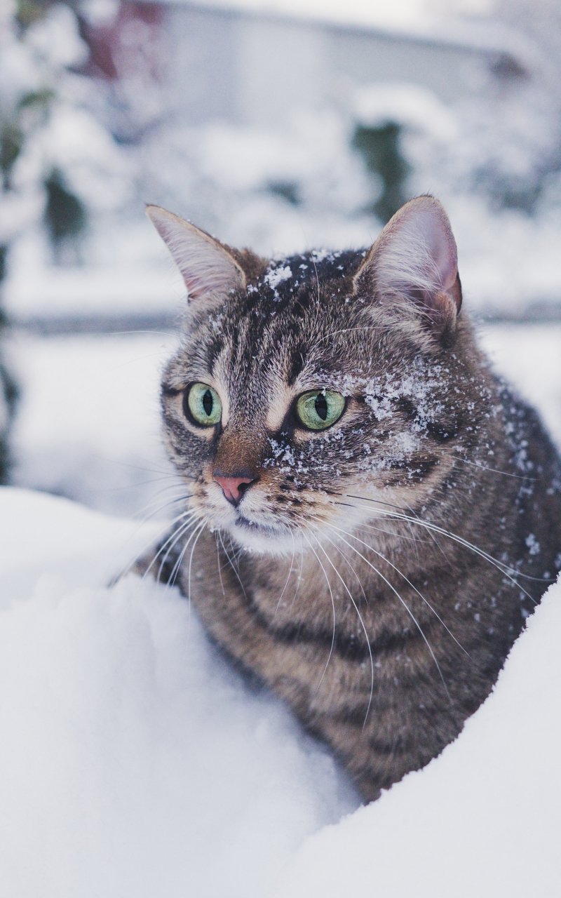 Обои: полосатый кот, снег, зеленые глаза - 800x1280