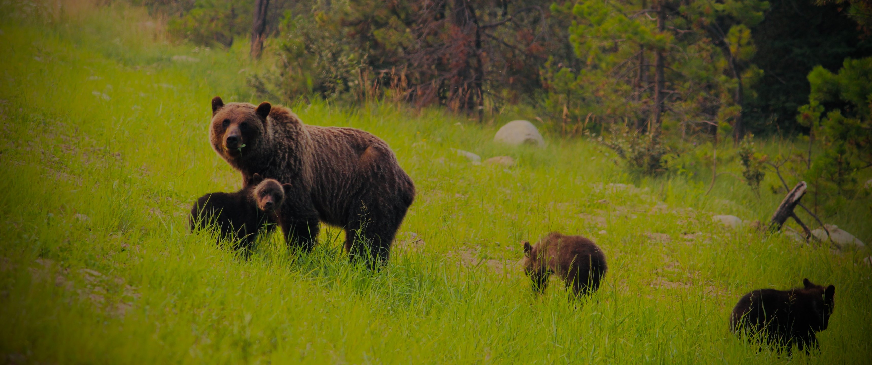 Обои: дикий лес, медведица с медвежатами - 3440x1440