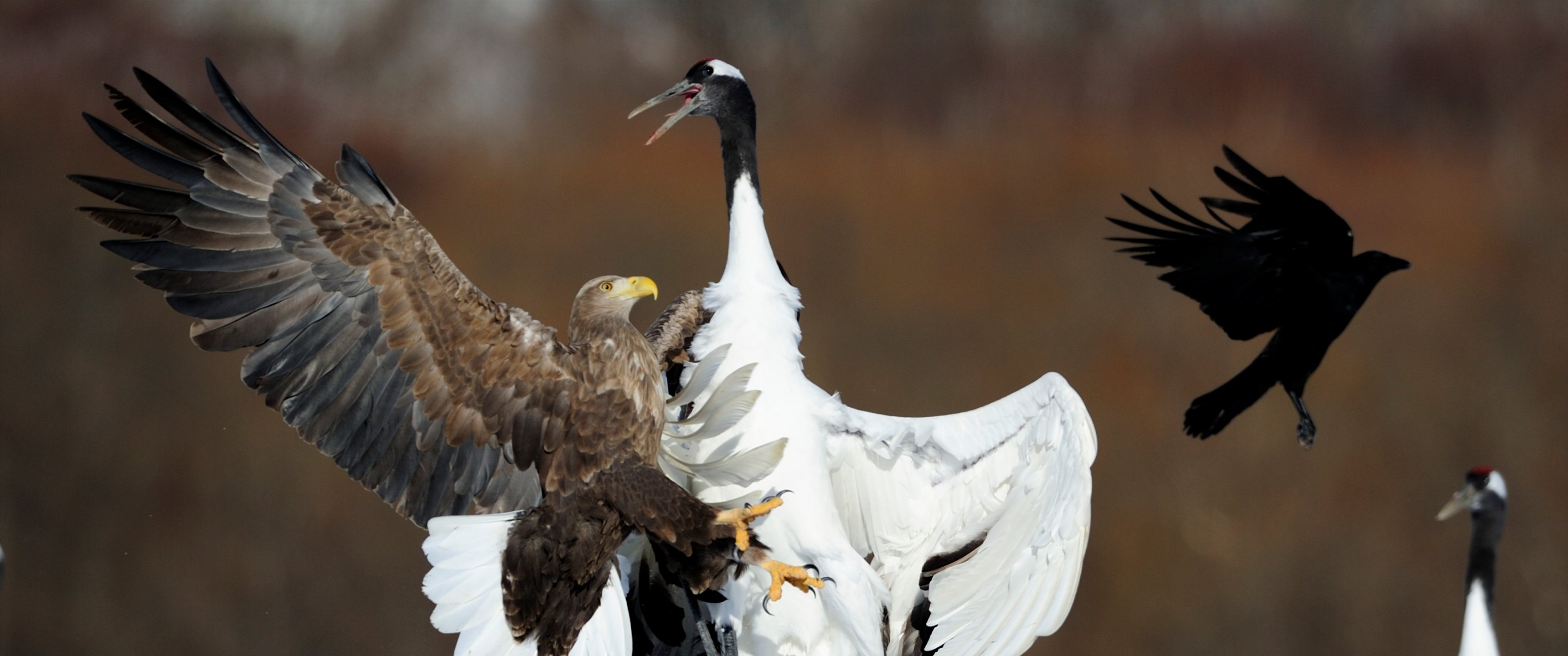 Обои: Цруи Мура, Япония, белоголовый орлан, журавль - 3440x1440