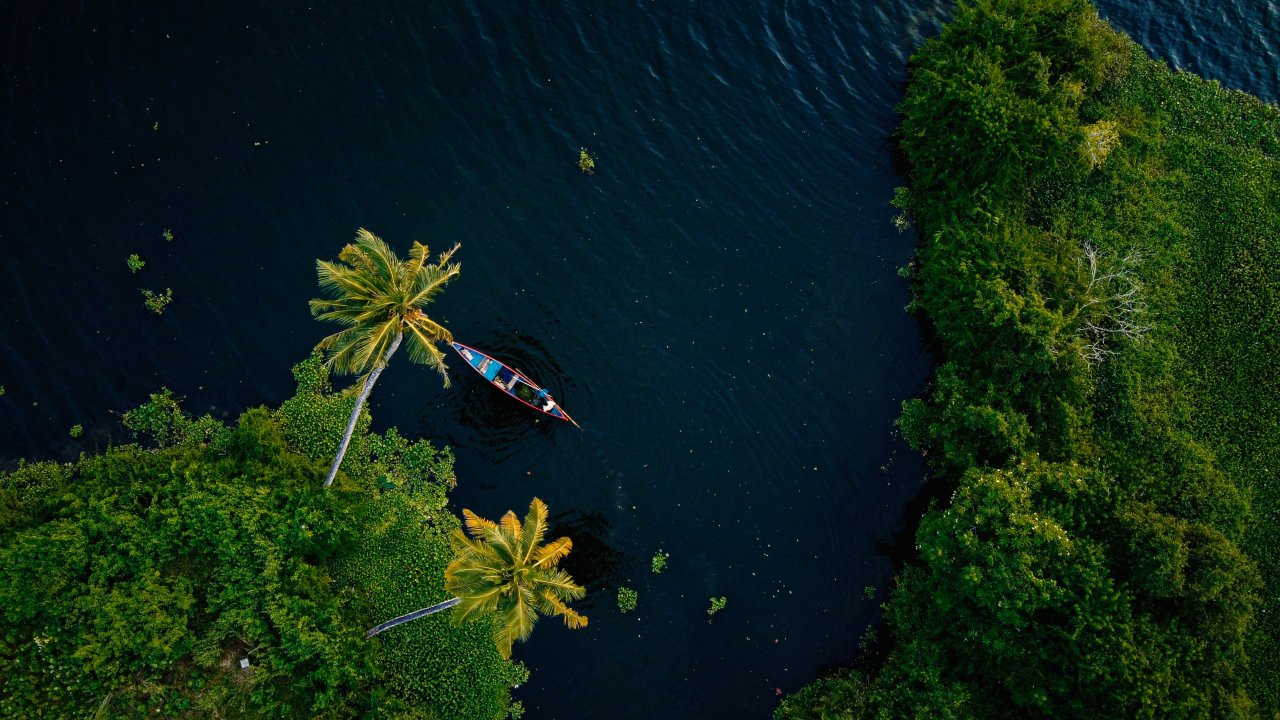 Обои: Алаппужа, Керала, Индия, пальмы, вода, транспорт - 1280x720