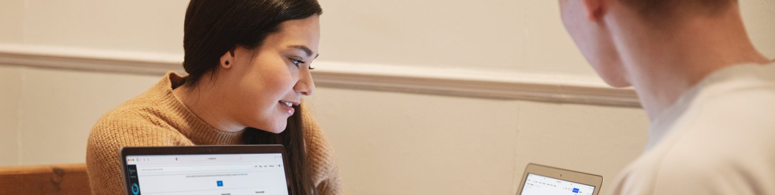 Обои: образование, парень с девушкой, работа за компьютером - 1590x400