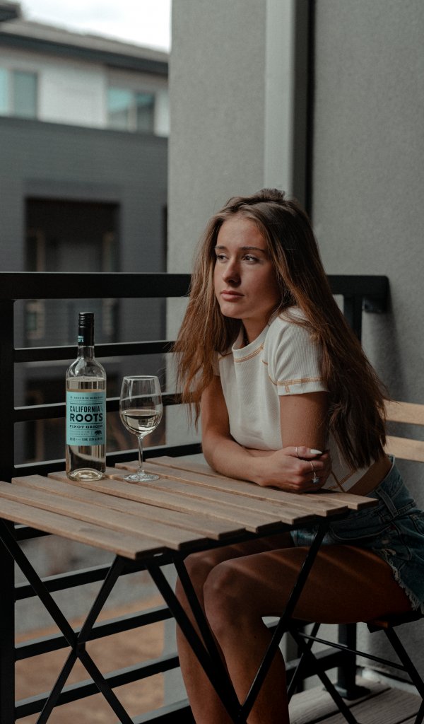 Обои: девушка, балкон, бутылка вина - 600x1024