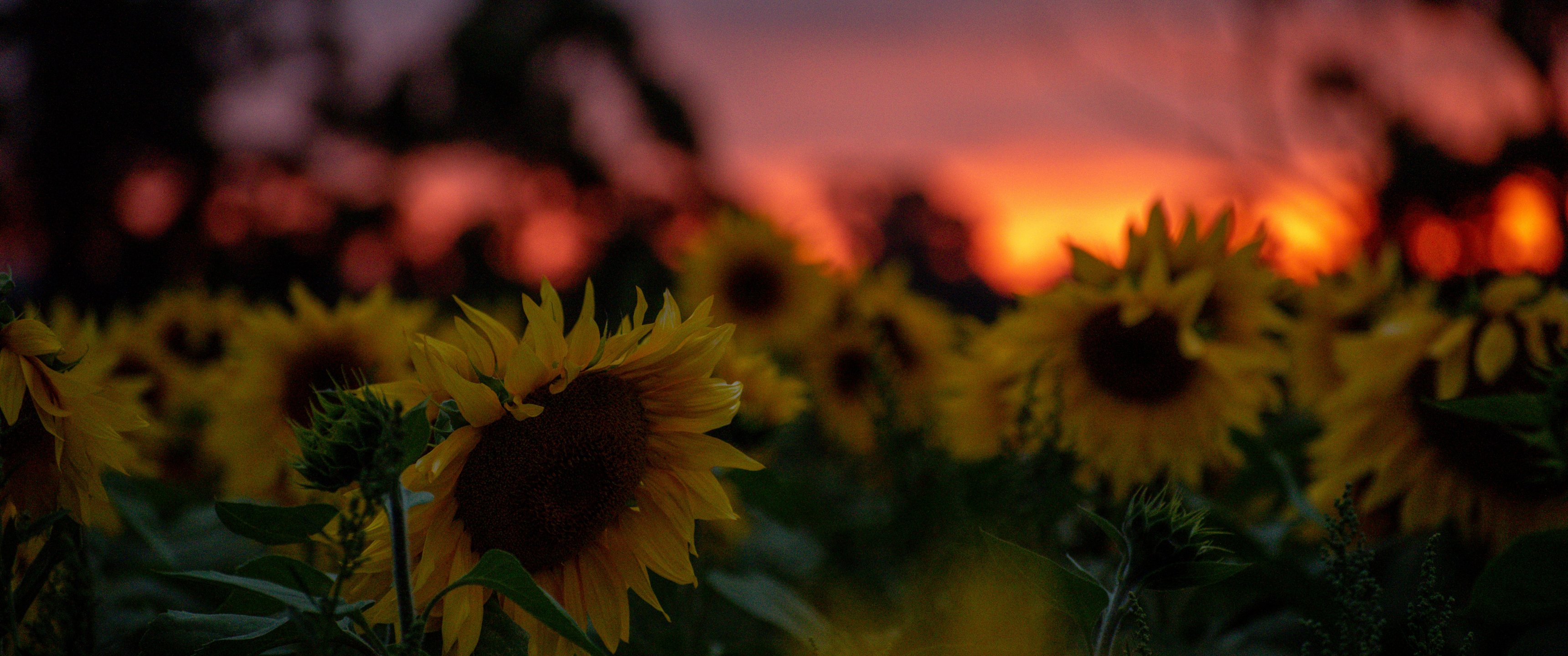 Обои: поле подсолнухов, закат, рассвет - 3440x1440