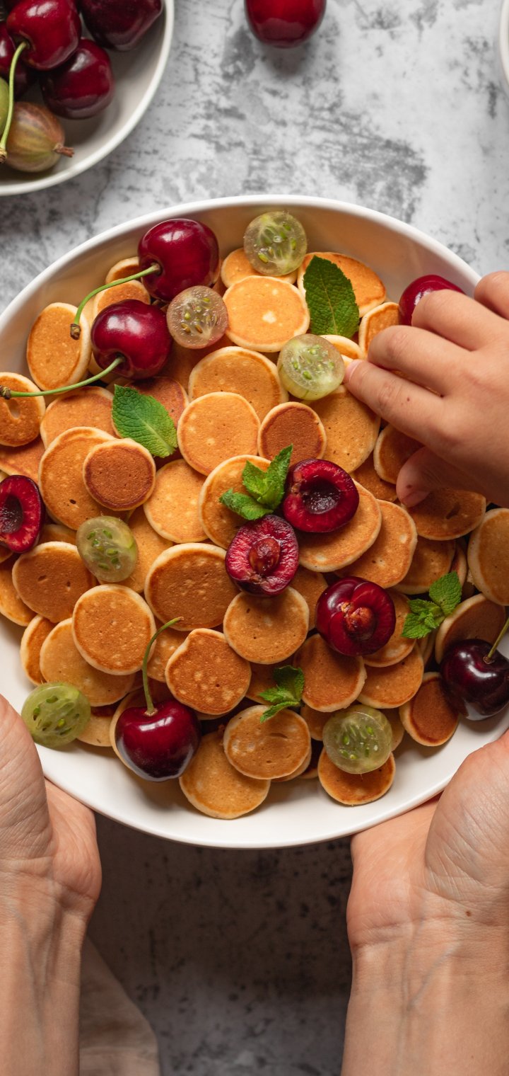 Обои: завтрак, оладьи, фрукты - 720x1520
