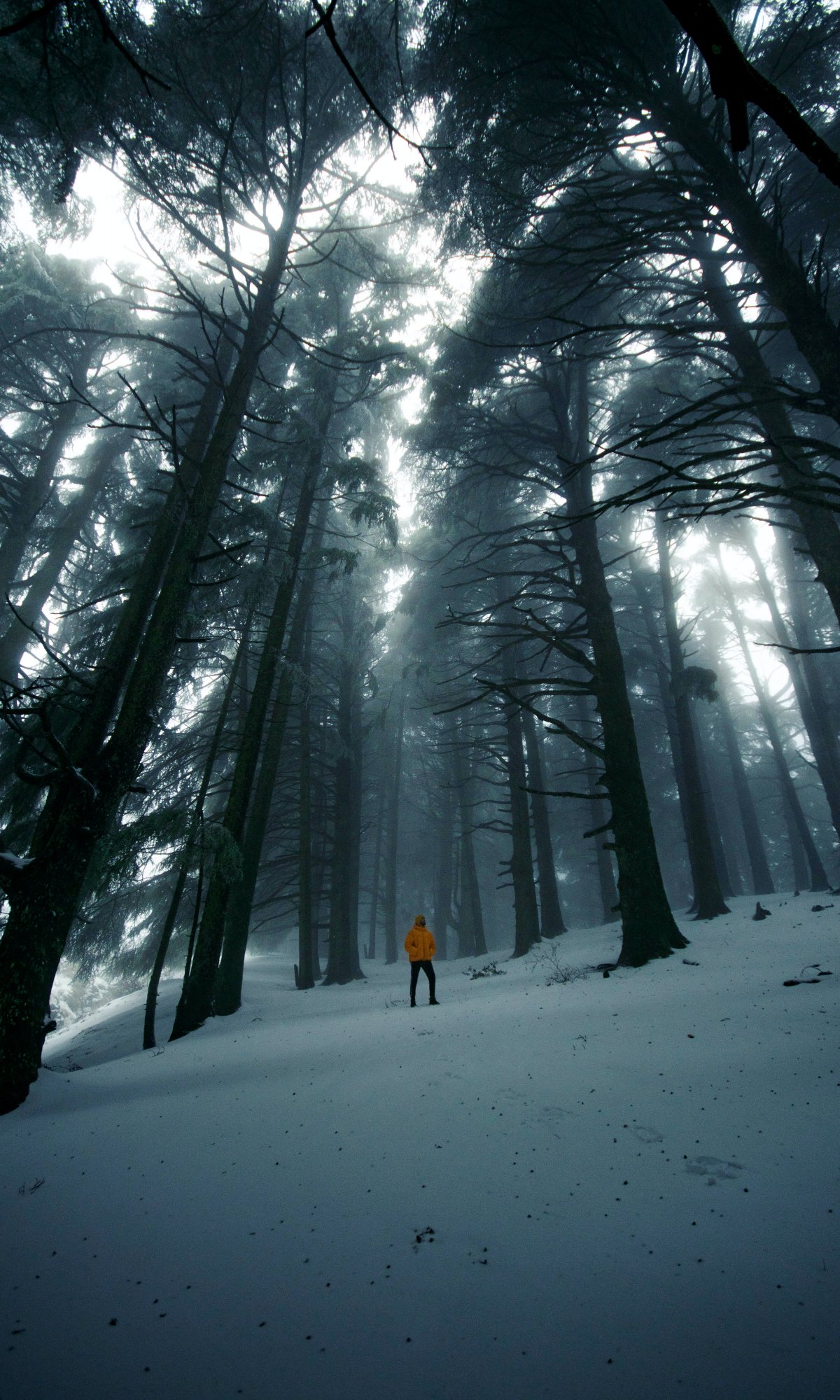 туманный лес, человек, снег