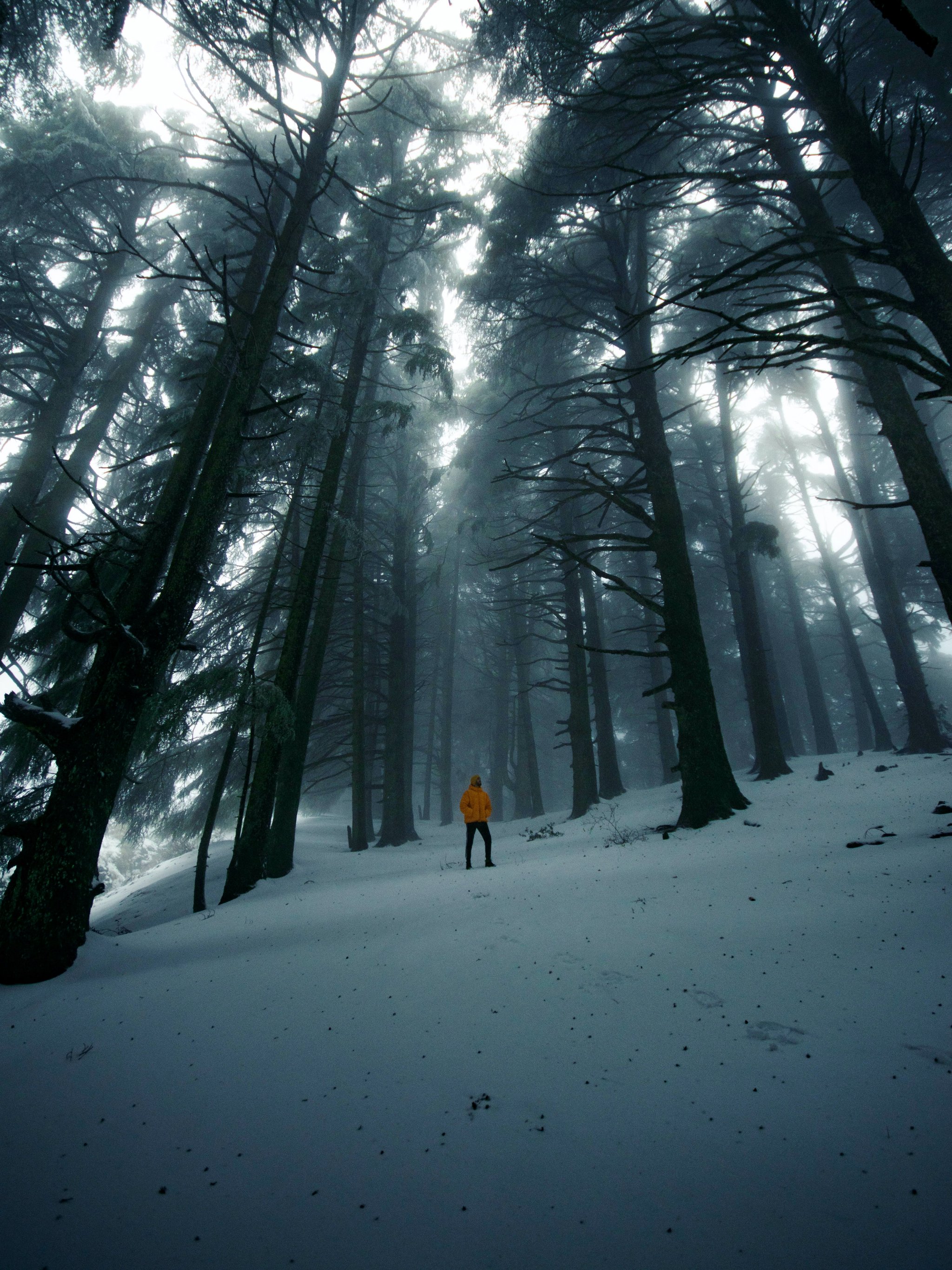 туманный лес, человек, снег
