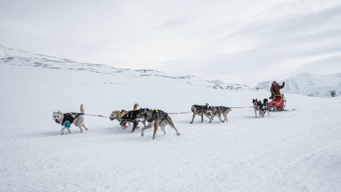 Обои: Шпицберген, Аляска, собачья упряжка - 1366x768