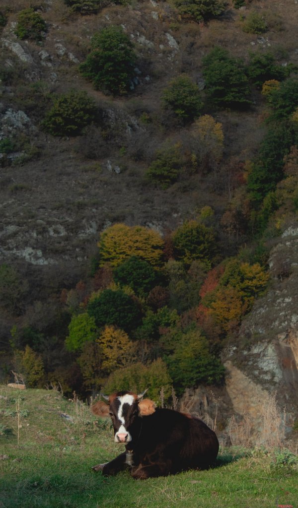 Обои: корова, буренка, в горах - 600x1024