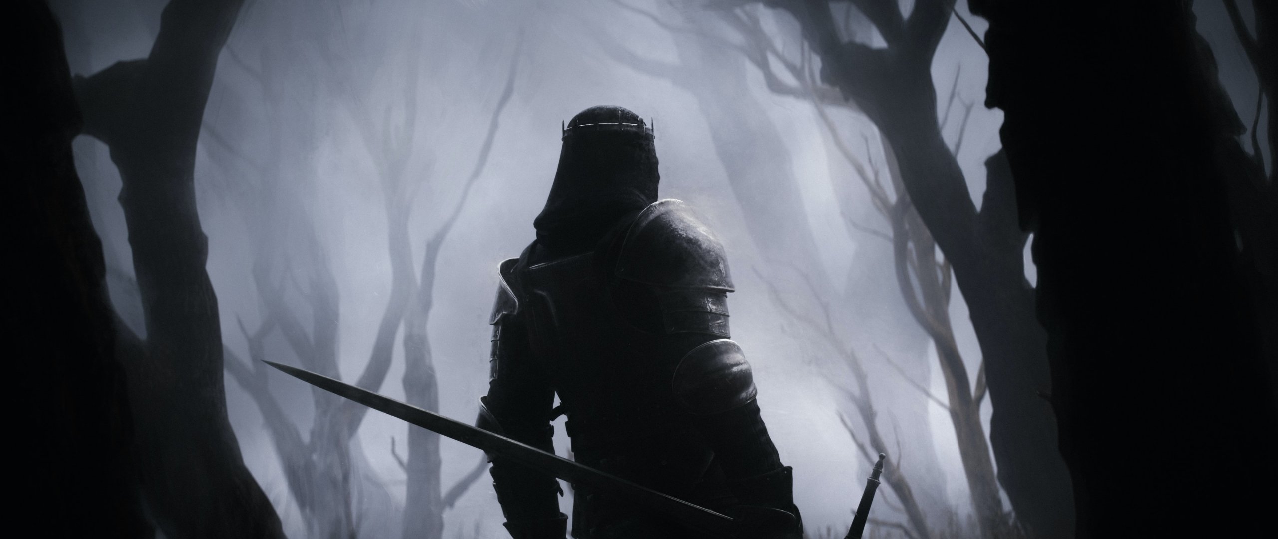 Обои: воин, лес, меч - 2560x1080